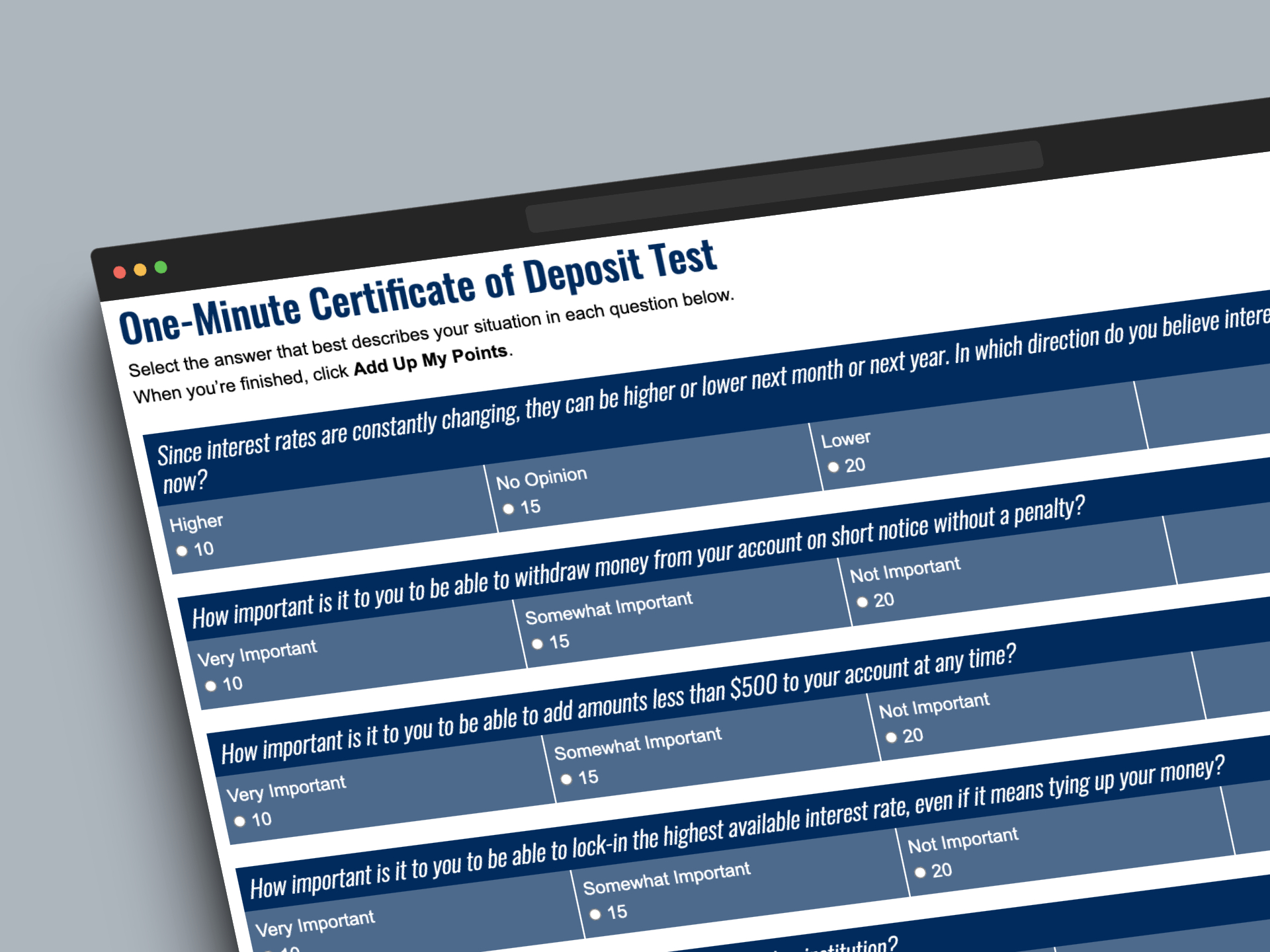 We offer Certificates of Deposit in a broad range of maturities, each designed with a particular goal in mind. And, for as little as $500, you can open your CD. To help you decide which CD will best meet your needs, take our One-Minute Certificate of Deposit Test. Then request a CD quote from one of our Customer Services Representatives today at (000) 000-0000.